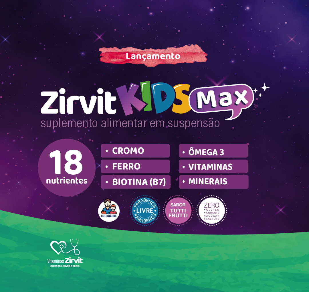 Suplemento alimentar de vitaminas, minerais e ômega 3 em suspensão.